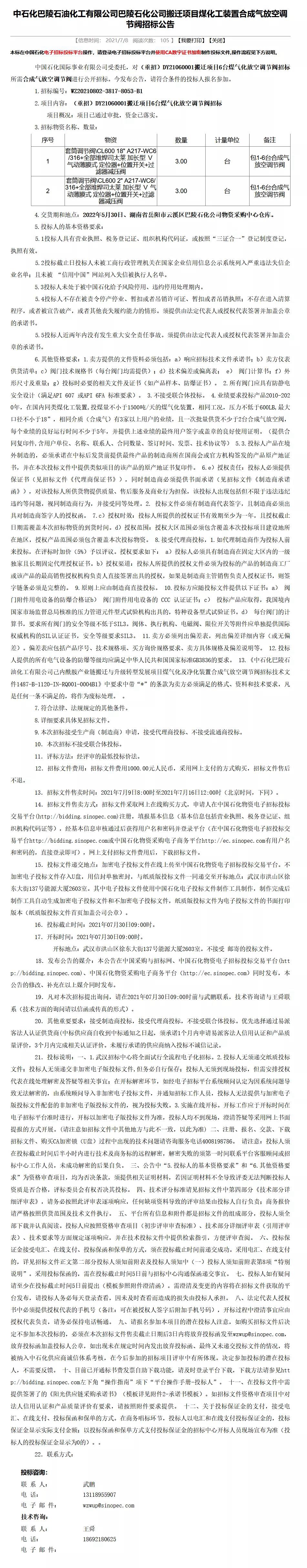 中石化巴陵石化巴陵石化搬遷項(xiàng)目煤化工裝置合成氣放空調(diào)節(jié)閥招標(biāo)公告