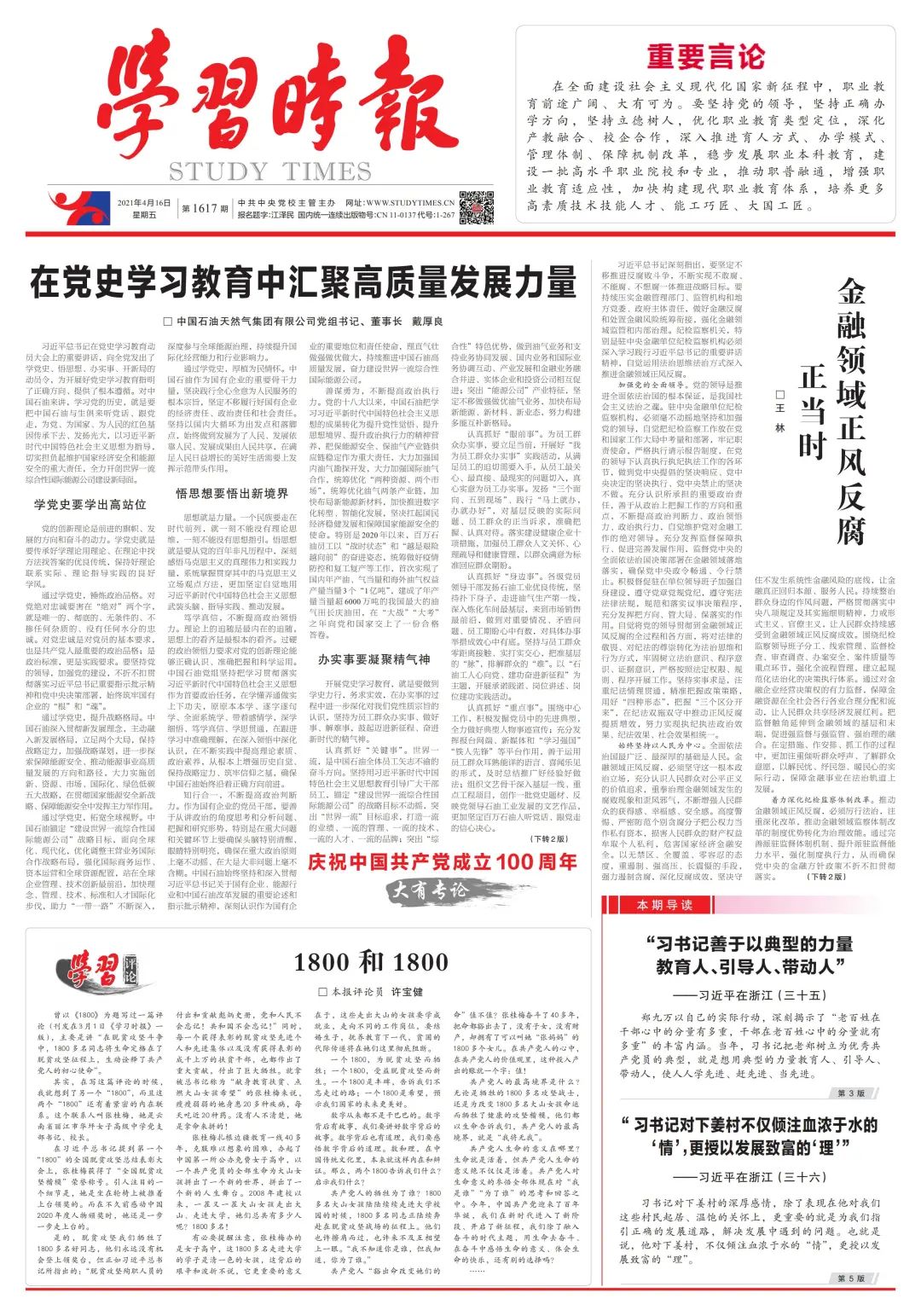 征途漫漫,惟有奮斗!中國石油將通過高標準高質量開展好黨史學習教育,切實做到學史明理、學史增信、學史崇德、學史力行,學出政治堅定,學出絕對忠誠,學出“四個自信”,繼續求真務實、戒驕戒躁,繼續艱苦奮斗、銳意進取,切實肩負起國有骨干企業的職責使命,全力開創世界一流綜合性國際能源公司建設新局面,為實現第二個百年奮斗目標、實現中華民族偉大復興而奮力拼搏,以優異成績慶祝建黨一百周年!