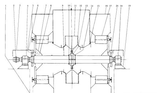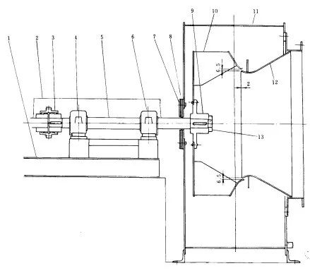 1一底板;2一聯軸器;3一軸承蓋;4一軸承;5一護板;6一壓蓋;7一填料護板;8一密封填料;9一軸;10一銷釘;11一葉輪;12一蓋板;13一輪轂;14一板;15一進口錐體;16一殼體;17一進口葉片調節控制裝置;18一軸承;19一軸承托架;20一冷卻風機