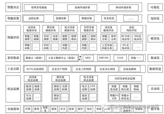 在設備設計 / 制造方面,開展故障可檢測性設計和工業互聯設計,提升裝備的故障感知能力、狀態辨識與預測能力和工業互聯能力;通過數字化、自動化、模型化、智能化、信息化等措施提升裝備本質安全設計水平;實現煉化企業全流程安全生產管控一體化,形成裝備運行狀態辨識與預測、自適應規劃控制與動態補償修復、智能維修決策等能力(見圖 1)。