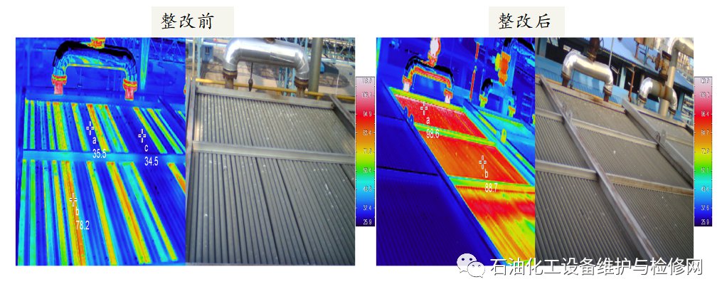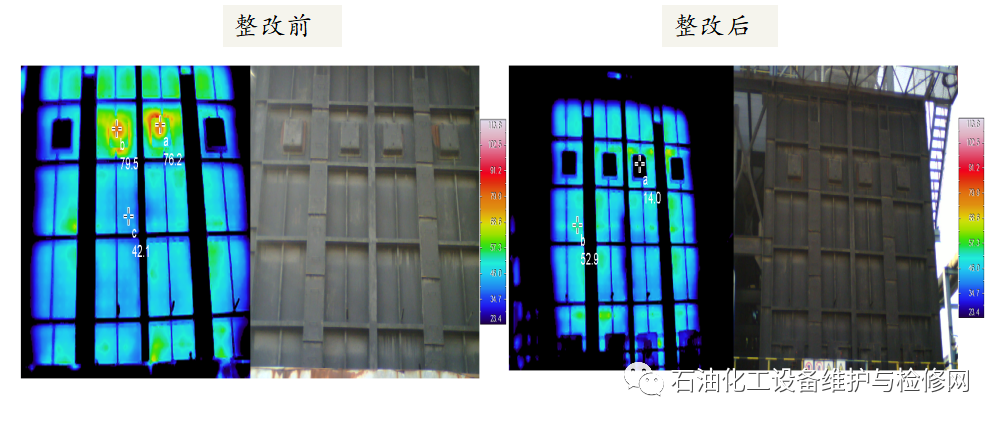 焦化爐輻射室防爆門外表面溫度80℃,SH/T3036-2012《一般煉油裝置用火焰加熱爐》,“加熱爐外壁溫度要求無風(fēng)27℃情況下不高于80℃”。判定為防爆門隔熱襯里損壞導(dǎo)致。