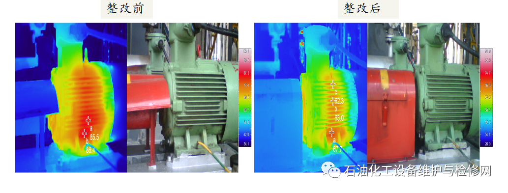 焦化壓縮機(jī)油站油泵電機(jī)定子溫度偏高(85℃,正常溫度65℃左右),初步判定為電機(jī)冷卻風(fēng)不足導(dǎo)致。