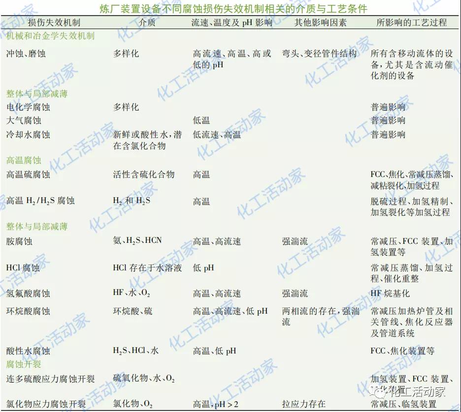 影響腐蝕的相關(guān)工藝條件主要有溫度、壓力、pH、流速及流態(tài)等,這些條件直接影響著腐蝕介質(zhì)的形成、轉(zhuǎn)變、傳遞以及其與鋼材的接觸、反應(yīng)。有的工藝條件可以導(dǎo)致緩蝕劑性能下降或分解,從而加速腐蝕。在腐蝕介質(zhì)的基礎(chǔ)上,以及相關(guān)工藝條件的影響下導(dǎo)致特定失效模式的形成,同時(shí)也讓裝置設(shè)備出現(xiàn)了某些特定的腐蝕敏感區(qū)域或部位。API571中給出了煉廠裝置設(shè)備各種失效模式與相關(guān)介質(zhì)和工藝條件影響之間的關(guān)系。