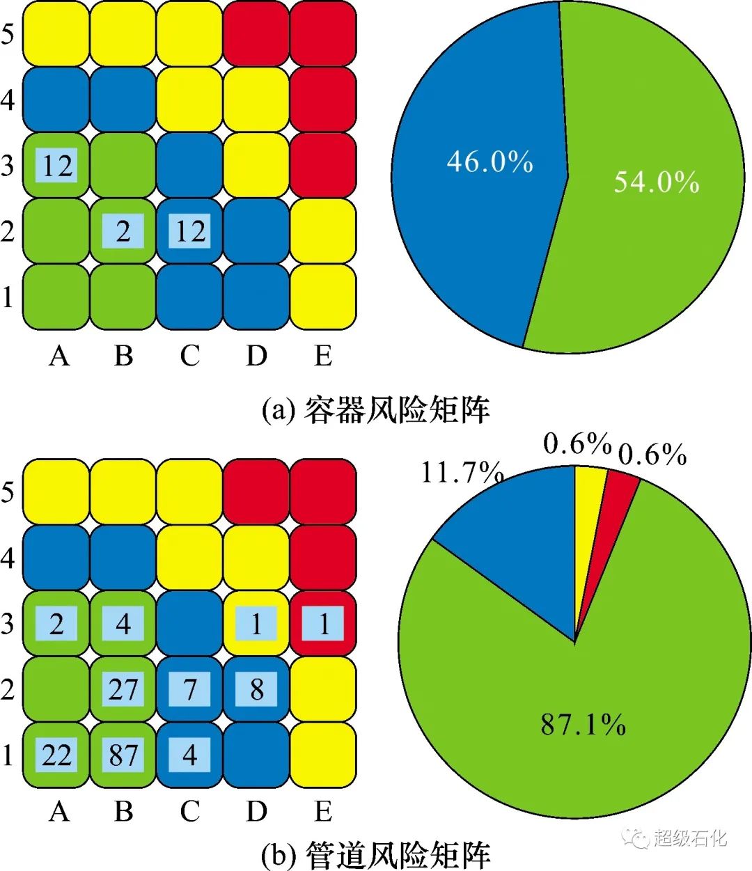(2)評估結果顯示:空氣分離裝置中無高風險和中高風險的容器,高風險和中高風險的管道數量均為1條,絕大部分容器和管道的風險等級均處于可接受范圍之內。