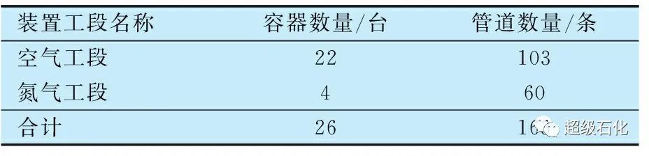 該空氣分離裝置投產于2009年,主要包括兩套45 000 m3/h的氧氣空分裝置,產品包括液態O2、液態N2、高壓O2、中壓N2和低壓N2等。該裝置原料為空氣,設計年產量O2為66 000.69×104 m3,中壓N2為23 500.87×104 m3,低壓N2為12 800.55×104 m3。此次參與風險評估的容器和管道數量統計見表1。