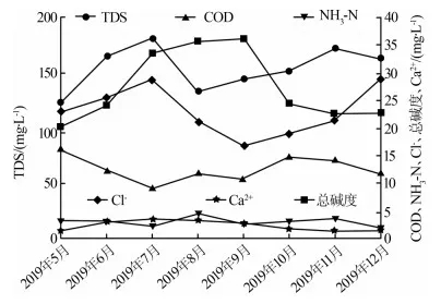 由圖 2可知,處理裝置RO及結晶單元產水混合后,TDS≤200 mg/L、COD≤20.0 mg/L、Cl-≤30.0 mg/L、氨氮≤4.5 mg/L、Ca2+(以碳酸鈣計)≤5.0 mg/L、總堿度(以碳酸鈣計)≤40.0 mg/L。水質優于循環水系統供水水質,可回用于循環水系統。