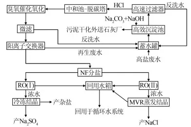 高鹽廢水整個處理流程包括預處理、納濾分鹽和鹽水分離三部分。預處理段包括高效沉淀、高速過濾、中和-脫碳、臭氧催化氧化、微濾、陽離子交換等,通過預處理,降低廢水中硬度、堿度、硅酸鹽、懸浮物、油分等有害組分,使廢水滿足膜元件和分鹽要求;納濾分鹽段利用納濾膜的道南離子效應和孔徑篩分原理將廢水分為NaCl(KCl)溶液和Na2SO4溶液;鹽水分離段包括NaCl鹽水分離部分和Na2SO4鹽水分離部分,分別利用RO膜再濃縮、MVR蒸發和冷凍結晶等將鹽水分離,工藝流程見圖 1。